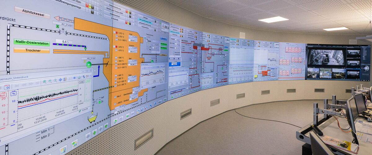 Das Highlight der neuen Leitwarte ist eine 12 Meter breite eyevis LED Rückprojektions-Videowand mit 18 Großbildschirmen. Die Videowand und mit ihr die gesamte Leittechnik wurde vor Einbau Signal für Signal getestet und konnte in nur zwei Monaten installiert werden. Sie visualisiert das komplette Klärwerk mit Abwasserbehandlung, Schlammaufbereitung und Schlammverbrennung sowie die technologischen Prozesse mittels Kameraüberwachung.