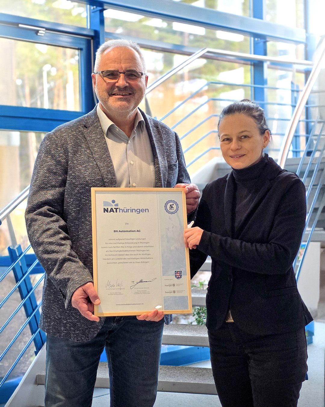 Die BN Automation AG wurde mit dem Dauerstatus im Nachhaltigkeitsabkommen Thüringen (NAT) ausgezeichnet. Mit dieser Auszeichnung würdigt das NAT das kontinuierliche und langjährige Engagement der BNA für nachhaltiges Wirtschaften.